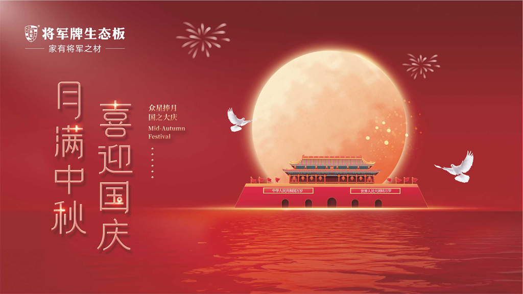 在新時代的曙光里我們迎來了偉大祖國74周年華誕韶華易逝而偉業(yè)不朽74載崢嶸歲月創(chuàng)造出令人驚嘆的“中國速度”和“中國奇跡”在這個舉國歡騰的時刻將軍牌生態(tài)板堅定綠色發(fā)展之路,為祖國74華誕獻(xiàn)禮!今年中秋遇上國慶,雙.