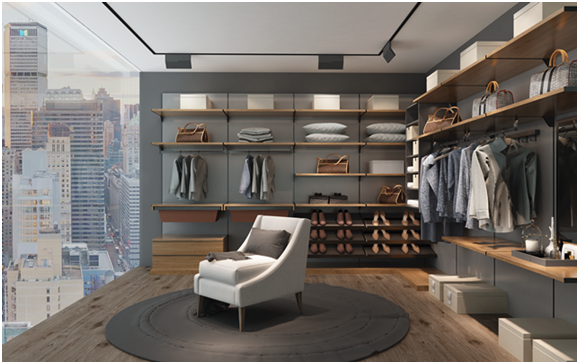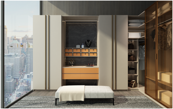 簡(jiǎn)約的同時(shí)增加設(shè)計(jì)感,賦予空間更高格調(diào),在使用上功能分明,中間可掛當(dāng)季要穿的衣服,便于搭配,其他封閉空間可存放換季衣服和棉被等,實(shí)用又美觀。
