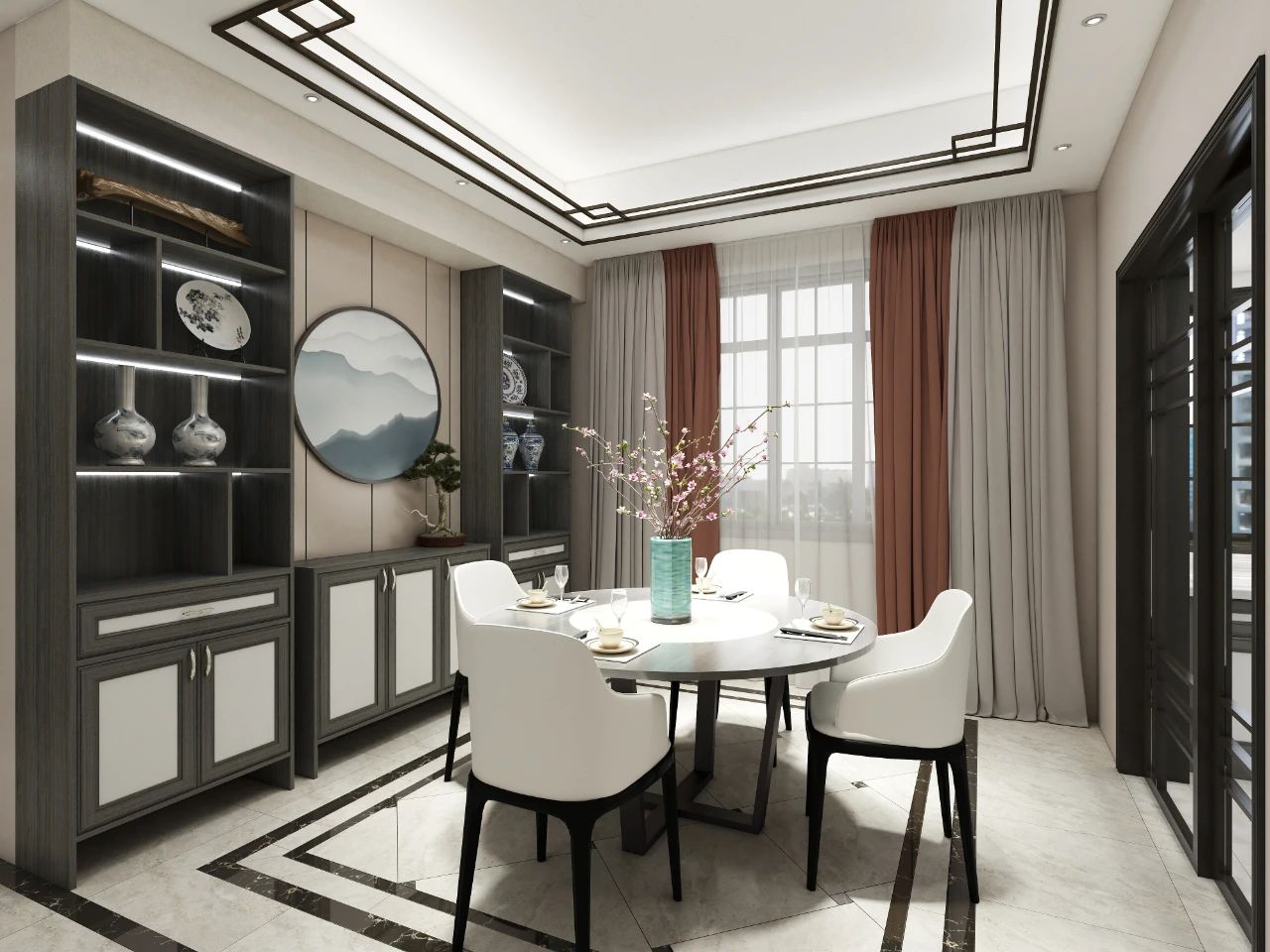 開(kāi)放式客餐廳一體化設(shè)計(jì),空間統(tǒng)一而獨(dú)立,寬敞更顯大氣,清新淡雅的水墨色彩為主基調(diào),突出了整體空間的色彩主題。